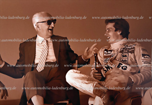 Original s/w Aufnahme Enzo Ferrari zusammen mit Gilles Villeneuve, Imola September 1980, 19,5x28,5cm, Rückseite mit Aufkleber des Fotografen "G.Sanna Imola"