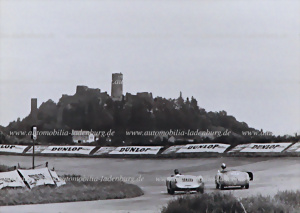 original s/w Aufnahme (Mailander), Helmut Polensky auf Porsche 550 neben Lucien Fernaud auf OSCA MT4, GP Deutschland 1954, 13x18cm