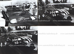 Konvolut 3 original s/w Aufnahmen, Bayer Kunststoffauto LEV 2000 Prototyp, 16x21cm