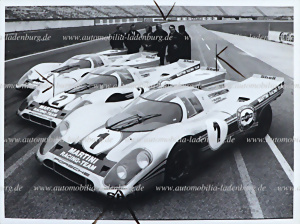original s/w Aufnahme, die 3 Porsche Martini 917 bei einer Präsentation in Hockenheim, 18x24cm