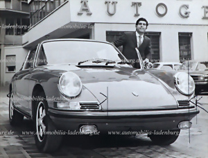 original s/w Aufnahme, Giacomo Agostini mit seinem Porsche 911, 18x24cm