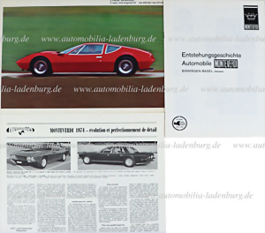 Konvolut 3tlg., darunter Einblattprospekt Monteverdi Hai 450SS / 375SS, Rückseite Monteverdi 375S, dazu Zeitungsbericht Monteverdi 1974, franz. Text, dazu Broschüre "Entstehungsgeschichte Automobile Monteverdi"