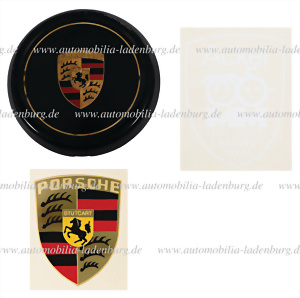Konvolut 3tlg., darunter Huptaste für Porsche 356 Lenkrad, Durchmesser 10cm, dazu Aufkleber Max Moritz Racing Team, 9,5x7cm, sowie Wasseraufkleber Porsche ca. 70er Jahre, 6,5x5,5cm