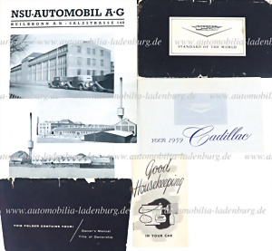 Konvolut darunter Betriebsanleitung Cadillac 1959, inkl. Pflegepass GM, im Umschlag (Umschlag beschädigt), dazu 30er Jahre Faltprospekt NSU-Automobile AG