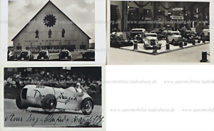 Konvolut 3 Fotopostkarten darunter u.a. Manfred von Brauchitsch auf Mercedes-Benz SSKL Stromlinie AVUS 1932; Mercedes-Benz Messestand Berlin; "Der deutsche Volkswagen - Tullio Cianetti Halle", 9x14cm