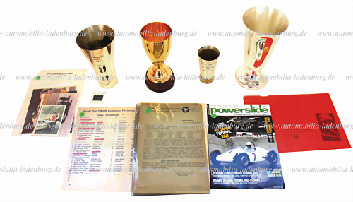 Großes Konvolut betreffend Formel V aus dem Archiv von Rainer Braun, darunter Siegerpokale, s/w Aufnahmen, Presseberichte..., u.a. Pokal Schauinsland Bergrennen 1966, Höhe 21cm; DMV-Spessart Bergrennen Ehrenpreis 1968, Höhe 27cm; Preis von Tirol 13.10.1968, Ehrenpreis der Formel V Europa;... mehr