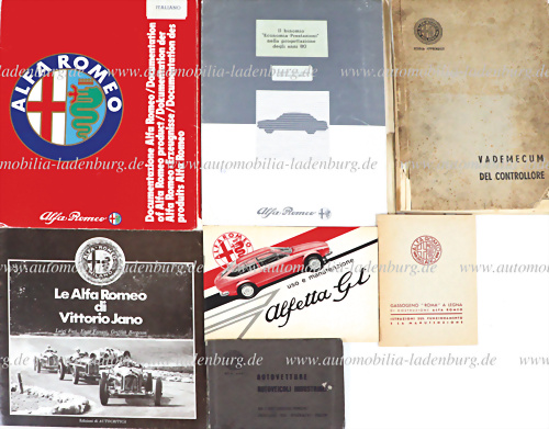 Konvolut darunter Kontrollhandbuch Alfa Romeo 1941 (Umschlag beschädigt); Bedienungsanleitung Alfa Romeo Gasgenerator "Roma" 1941; technische Angaben Autovetture / Autoveicoli Industruiali Alfa Romeo 1944; Broschüre "Le Alfa Romeo di Vittorio Jano"; Pressemappe Alfa Romeo 1983; Pressemappe /... mehr