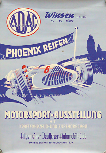 Original Veranstaltungsplakat „ADAC Motorsport-Ausstellung Winsen an der Luhe“, 59x41cm, kleinere Einrisse an den Rändern, ansonsten guter Zustand