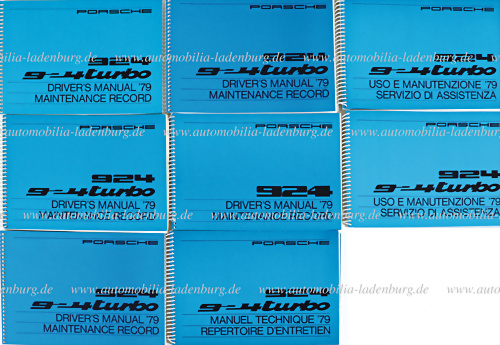 Konvolut 7 Betriebsanleitungen Porsche 924 Turbo Modelljahr 1979, darunter 9x mit Pflegepass, 1x franz. / 2x ital. / 4x engl. Text, ohne Eintragungen