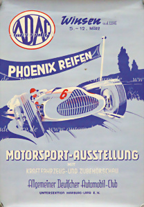 Original Veranstaltungsplakat „ADAC Motorsport-Ausstellung Winsen an der Luhe“, 59x41cm, kleinere Einrisse an den Rändern, ansonsten guter Zustand