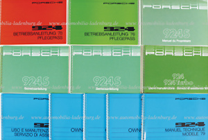 Konvolut 11 Betriebsanleitungen darunter 5x Porsche 924 Modelljahr 1979, 3x engl. / 1x ital. / 1x franz. Text; Porsche 924 Modelljahr 1976, 1978 mit Pflegepass, deutscher Text; 2x Betriebsanleitung Porsche 924S 1985, deutscher Text; Porsche 924S 1986, franz. Text, sowie Porsche 924 / 924 Turbo Modelljahr 1983, ital. Text