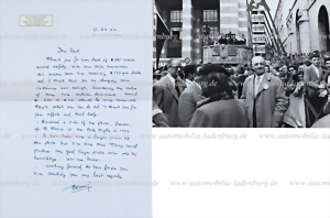 Handsignierte s/w Aufnahme (Abzug neueren Datums), Enzo Ferrari bei der Mille Miglia 1954, Rückseite signiert von Fotograf Bernard Cahier, 18x24cm, inkl. handgeschriebenem Brief, signiert von Bernard Cahier