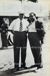 Original s/w Aufnahme Enzo Ferrari zusammen mit Giuseppe Campari, Enzo Ferrari trägt auf der linken Seite an der Hose den goldenen Orden der Scuderia Ferrari an einer Schleife (ein identischer Orden wurde an Piero Taruffi verliehen)14,5x10cm