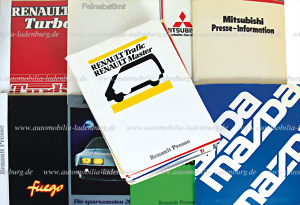 Großes Konvolut Presseinformationen verschiedener Hersteller 70er / 80er Jahre, darunter z.B. Pressemappe Renault 5 Turbo; Renault 18 Turbo; Mitsubishi Lancer 2000 ECI; Pressemappe Renault Alpine A310 V6 1981; Renault 20 Diesel TX 2,2L; Mazda Modellprogramm 1982; Opel Chevette 1980; Mitsubishi Modellprogramm 1982; Renault Fuego;