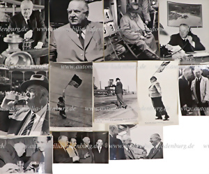 Konvolut 12tlg. original s/w Aufnahmen, darunter u.a. zwei Pressefotos mit Theodor Heuss, gestempelt „Presse Foto”/ „B. Schmitz-Sieg”, Aufnahme mit Dr. Adenauer, sowie weitere Portraits und Fotos an der Rennstrecke, versch. Formate