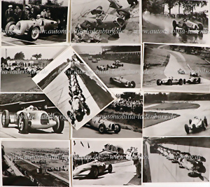 Konvolut 18tlg. darunter 10 original s/w Aufnahmen sowie 8 Abzüge (50er/60er Jahre), Auto Union Motorsport 30er Jahre, darunter Rudi Haase beim GP Deutschland 1937; Aufreihung Typ C GP Wagen und Bernd Rosemeyer Eifelrennen 1937; Bernd Rosemeyer auf Auto Union 16 Zylinder beim GP Deutschland 1936, etc. je ca 13x17,5 cm.