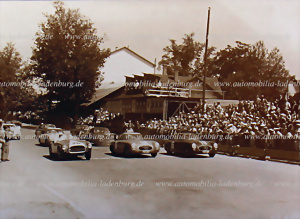 1952, orig. s/w Aufnahme GP Bern Start, nebeneinander von links Willy Daetwyler auf Ferrari 340 America Vignale Spider (#0196A), Karl Kling auf Mercedes-Benz 300 SL (#004) sowie Rudolf Caracciola auf Mercedes-Benz 300 SL (#005), ca. 11x15 cm.
