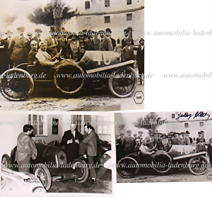 Konvolut 3 tlg. s/w Aufnahmen Austro-Daimler Sascha Rennwagen, darunter Foto handsigniert von Georg Auer, Targa Florio 1922 auf Sascha Rennwagen #46, neben ihm Fahrer Alfred Neubauer, sowie eine unsignierte großformatige Version, dazu ein original Porsche Werksfoto Alfred Neubauer vor Sascha Rennwagen, Rückseite gestempelt "Werkfoto", versch. Formate.