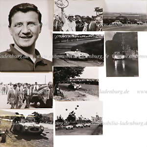 Konvolut 24 tlg. darunter 9 original s/w Aufnahmen, 10 spätere Abzüge, 4 Audi Autogrammkarten sowie 2 Aufkleber, darunter u.a.: zwei handsignierte Audi V8 Quattro Postkarten eninmal W. Röhrl & einmal H.J. Stuck; 1924 Alfred Neubauer auf Mercedes-Benz Rennwagen, Targa Florio 1924; Fangio auf W196 Gp von Buenos Aires 1955; Michael Schumacher auf C291, etc. versch. Formate