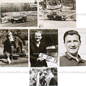 Konvolut 6 tlg. original s/w Aufnahmen, darunter u.a.: S.Spiess bei Krähbergrennen 1967, NSU Prinz 1000, sowie Originalaufnahme Richard von Frankenberg mit Siegerkranz 10.06.1950, etc., versch. Formate