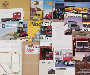 40er-90er Jahre Konvolut 77tlg. Falt-/ Einblattprospekte & Kataloge für Mack Nutzfahrzeuge, en Text, guter Zustand