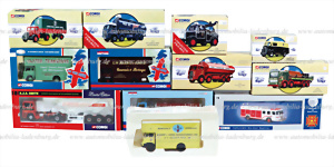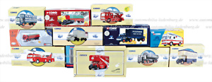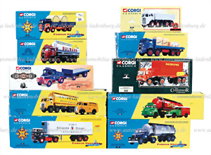 Konvolut 11tlg. Modelle Nutzfahrzeuge von Corgi, darunter z.B.: zwei Limited Edition Guiness Modelle (Leyland Octopus & AEC Ergomatic); "The British Rail Set" (1/5000); Guy Invincible Tipper; "British Road Services BRS Lorry", Scammel Scarab, etc., Maßstab 1:50, im Originalkarton, guter Zustand