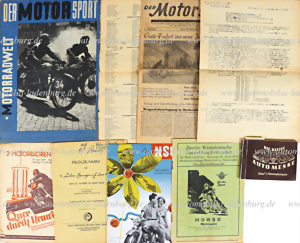 Konvolut 10 tlg. darunter Programmheft "1. Lahn-Burgen.Fahrt, innen mit Nennungen der jeweiligen Klassen, dazu 2 Blatt Ausführungsbestimmungen; Programmheft "2. Westdeutsche Zuferlässigkeitsfahrt", innen mit Nennungen der jeweiligen Klassen, dazu 2 Seiten Durchführungsbestimmungen, mit handschriftlicher Ergebnisliste, Programmheft 2.Motorradrennen 19.04.1947 (unvollständig) sowie 3 Ausgaben "Der Motorsport" 1947/48, gebrauchter Zustand