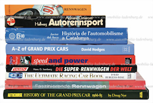 Bücherkonvolut 9tlg. darunter z.B.: „History of the Grand Prix Car 1966-85” von D. Nye; „Rennwagen von 1895 bis 1965” von Dausien; „Historia de l`automobilisme a Catalunya” von J. del Arco, versch. Sprachen. Weitere Titel entnehmen Sie bitte unserem Katalogbild