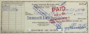 23.01.1974, handsignierter Scheck von Luigi Chinetti Motors Inc., an Ferrari SpA Modena, in Höhe von 1300$ für Ersatzteile, signiert von Luigi Chinetti, rückseitig signiert von Ferrari Spa