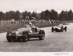 original s/w Aufnahme Grand Prix Monza 28.5.1950, Alberto Ascari auf Ferrari 166 F2 vor Hans Stuck auf AFM, 18x24cm