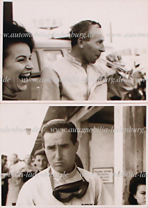 Konvolut zwei original s/w Aufnahmen Grand Prix Deutschland 1964, u.a. Lorenzo Bandini in der Boxengasse, sowie John Surtees mit seiner Frau Patricia Burke nach dem Sieg auf Ferrari 158, je 9x12cm