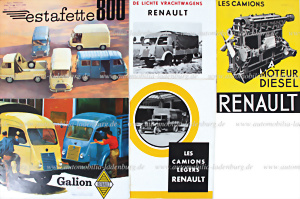 Konvolut 6 Verkaufsprospekte 30er-60er Jahre, Renault LKW, u.a. 1931, Verkaufskatalog „Les Caminons Legers Renault“, (Umschlag lose); 1932, Verkaufskatalog „A Moteur Diesel“; Frachtwagen Renault Motor Typ 88, niederl. Text; Modellprogramm „Estafette 800“ niederl. Text; Verkaufskatalog Renault Galion, niederländischer Text