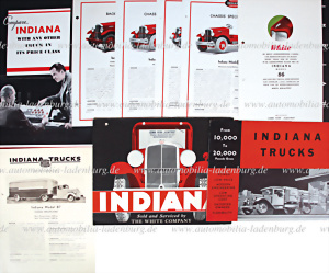 Konvolut 9 Verkaufsprospekte Indiana LKW, u.a. Modell 86, niederl. Text; Modell 43DR, 17SW-251, 17DR, 85, 87 (niederl. Text), 1932, Faltprospekt Modellprogramm; 1933, Faltprospekt; 1932, Verkaufskatalog Indiana Serie 95, englischer Text, teilweise gelocht