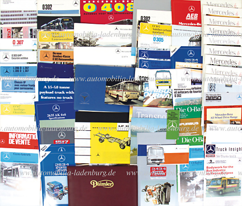 60er-2000er Jahre Konvolut über 80 tlg., darunter zahlreiche Verkaufsprospekte / Kataloge, Mercedes Benz Nutzfahrzeuge wie z.B.: O 319; O-Bahn; O 302; O 305; Gyro-Antrieb; OF-Chassis; L307 D; de./fr./nl. Text, dazu "Daimler of Coventry" im Ledereinband sowie 9 Ausgaben Mercedes Benz Zeitschrift von... mehr