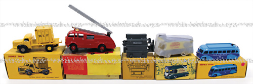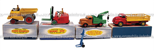 Konvolut 5 tlg. Dinky Supertoys, darunter Nr. 401 "Fork Lift Truck"; Nr. 430 Breakdown Lorry; Nr. 531 "Leyland Comet Lorry"; Nr. 962 "Dumper Truck", guter Zustand im Originalkarton, sowie lose Sackkarre