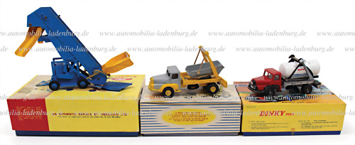 Konvolut 3 tlg. Dinky Modelle, darunter Nr. 805 "Unic Multimulden und Tanklastkraftwagen", Mulde fehlend, Nr. 895 "Unic Multibucket Van sowie Nr. 964 "Elevator Loader", im Originalkarton, sehr guter Zustand