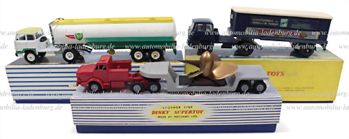 Konvolut 3 tlg. Dinky Modelle, darunter Nr. 803 "Sattelschlepper Unic und Sattelschlepper SNCF"; Nr. 887 "Sattelschlepper Unic und Tankauflieger Air BP" sowie Nr. 986 "Mighty Antar Low Loader with Propeller, sehr guter Zustand, im Originalkarton