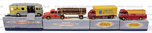 Konvolut 4 tlg. Dinky Supertoys Modelle, darunter Nr. 897 "Willeme Schlepper mit Lastanhänger"; Nr. 923 " Big Bedford Van "Heinz"; Nr. 979 "Racehorse Transport" sowie Nr. 991 " A.E.C. Tanker", sehr guter Zustand, im Originalkarton