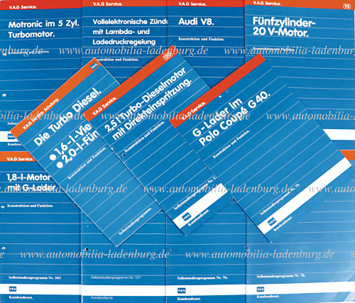 80er/90er Jahre, Konvolut 11 tlg. V.A.G. Service Hefte Konstruktion und Funktion aus dem Selbststudienprogramm, darunter u.a.: "V-R-6 Motor; "Fünfzilynder 20 V Motor"; "Audi V8"; "Motronic im 5 Zyl. 20V Motor", etc. de. Text, mit Gebrauchsspuren