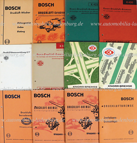 50er Jahre, Konvolut 12 tlg. Bedienungsanleitungen/ Broschüren Druckluft Bremsvorrichtungen, darunter u.a.: Knorr-Druckluft-Bremsen "K 523"; Druckluft Bremsvorrichtung LZ 7; Bosch Druckluft-Wischer; Bosch Druckluft-Servobremse, etc. de. Text, guter Zustand