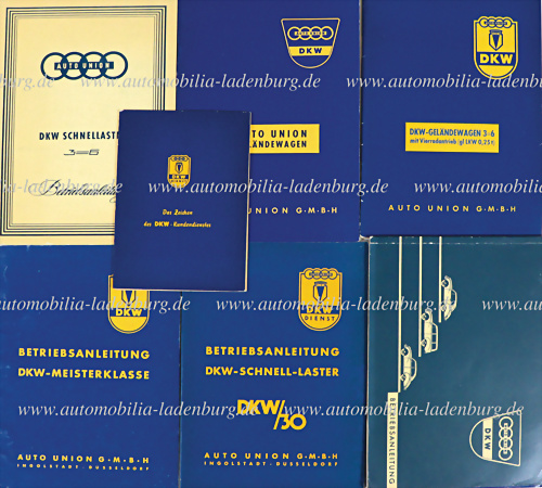 50er Jahre, Konvolut 8 tlg., Betriebsanleitungen, darunter DKW-Geländewagen 3=6; Auto-Union Geländewagen; DKW/30; DKW Schnellaster 3=6, etc. de. Text, leichte Gebrauchsspuren