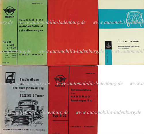 50er-60er Jahre, Konvolut 5 tlg. Betriebsanleitungen, darunter Hanomag Radschlepper R 22; Büssing 5 Tonner; Deutz Sirius/ Mercur/ Saturn; Handbuch Büssing Typ 5500 sowie Ersatzteilliste L 28/ L-L 28/ L 2t-L28