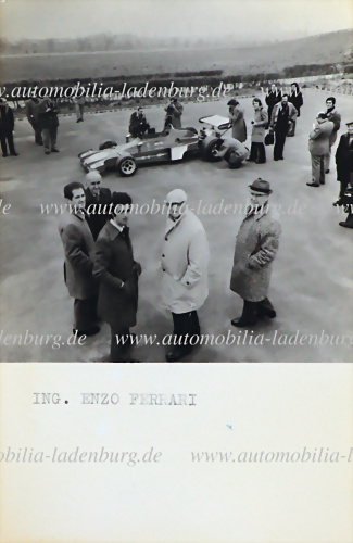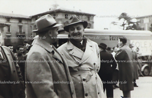 Original s/w Aufnahme Enzo Ferrari im Gespräch, im Hintergrund der Ferrari Renntransporter, 8x13cm, Rückseite gestempelt "Foto Montesano Bologna"