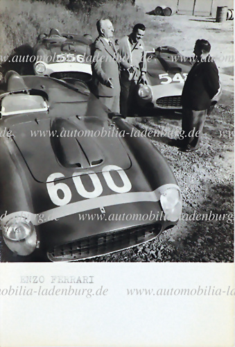 Original s/w Aufnahme Enzo Ferrari im Gespräch, um Ihn die Mille Miglia Rennwagen 1956, Ferrari 290MM (#0626) von Juan-Manuel Fangio; Ferrari 860 Monza (#0602M) von Musso / Luglio, sowie Ferrari 290MM (#0616) von Castelotti, 14x9cm
