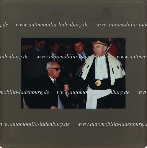 Original Farbdiapostiv Enzo Ferrari bei der Verleihung der Ehrendoktorwürde, Universität Modena „laurea honoris causa in Fisica dall´Universita di Modena“ 01.Februar.1988, inkl. Farbabzug 21x15cm