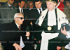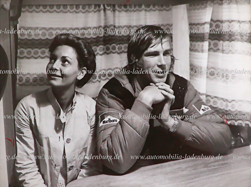 Original s/w Aufnahme Marlene Knaus und James Hunt, GP Italien 1976, Rückkehr von Niki Lauda nach seinem schweren Unfall beim Großen Preis von Deutschland 1976, 18x24cm, gestempelt "A.H.Rottensteiner"