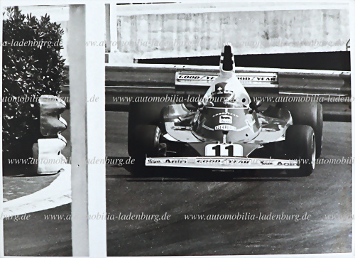 Original s/w Aufnahme Clay Regazzoni auf Ferrari 312T, GP Monaco 1975, 18x24cm, gestempelt "A.M.Begsteiger"
