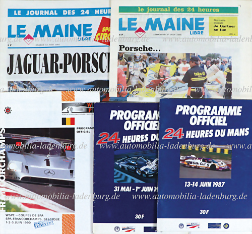 Konvolut 3 Programmhefte darunter 24 Stunden Le Mans 1986, 1987, sowie WSPC Coupe de SPA 1990, Programmheft Le Mans 1986 signiert u.a. von Fitzpatrick, Ballot-Lena, Bell, Ludwig, Stuck, Cheever, Brun, Redman, Heyer..., dazu zwei Tageszeitungen "Le Maine" zu Le Mans 1986 und 1987