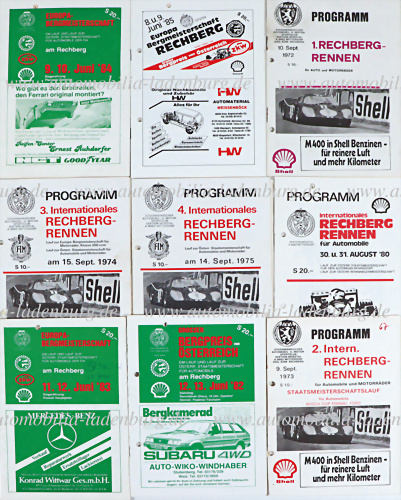 Konvolut 9 Programmhefte Rechbergrennen, 1972, 1973, 1974, 1975, 1980, 1982, 1983, 1984, 1985, mit Teilnehmerliste, u.a. Fahrzeuge wie Porsche 930, Lotus 61, BMW 2002Tii, Fiat-Abarth...., gelocht, teilweise mit Notizen