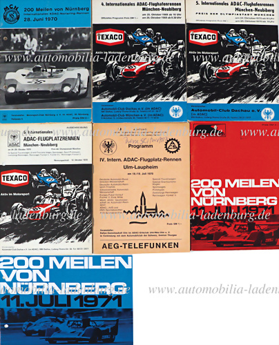 Konvolut 5 Programmhefte darunter 200 Meilen von Nürnberg 1970; 200 Meilen von Nürnberg 1971 (inkl. Ausschreibung); ADAC Flugplatzrennen Ulm-Laupheim 1970; ADAC Flughafenrennen München-Neubiberg 1969 und 1970 (1970 inkl. Ausschreibung), gelocht